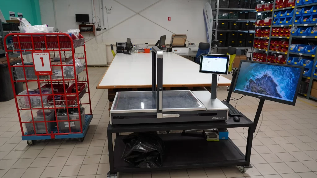 A képen látható berendezés a fulfillment szolgáltatásunk szíve: egy automatizált mérőállomás, amellyel minden beérkező terméket azonnal, milliméteres pontossággal mérünk le. Ez a rendszer: